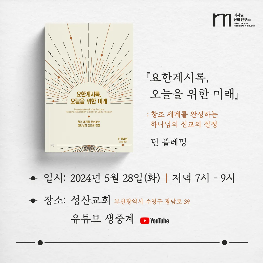 딘 플레밍의 Foretaste of the Future (IVP Acadmeic, 2022)의 한국어판 <요한계시록, 오늘을 위한 미래>가 사단법인 미셔널신학연구소와 IVP를 통해 5월 말 출간됩니다. 이 책은 선교적 성경 해석학의 관점으로 요한계시록을 바라보면서 이 신비하고 놀라운 성경이 1세기 독자들에게 어떻게 이해되었는지, 그리고 오늘날 교회에게 어떻게 말씀하고 있는지를 통찰력 있게 제시하고 있습니다.